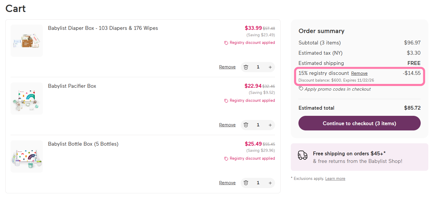At checkout, your registry discount is automatically applied to eligible items. You’ll also see your remaining balance and when the discount expires.