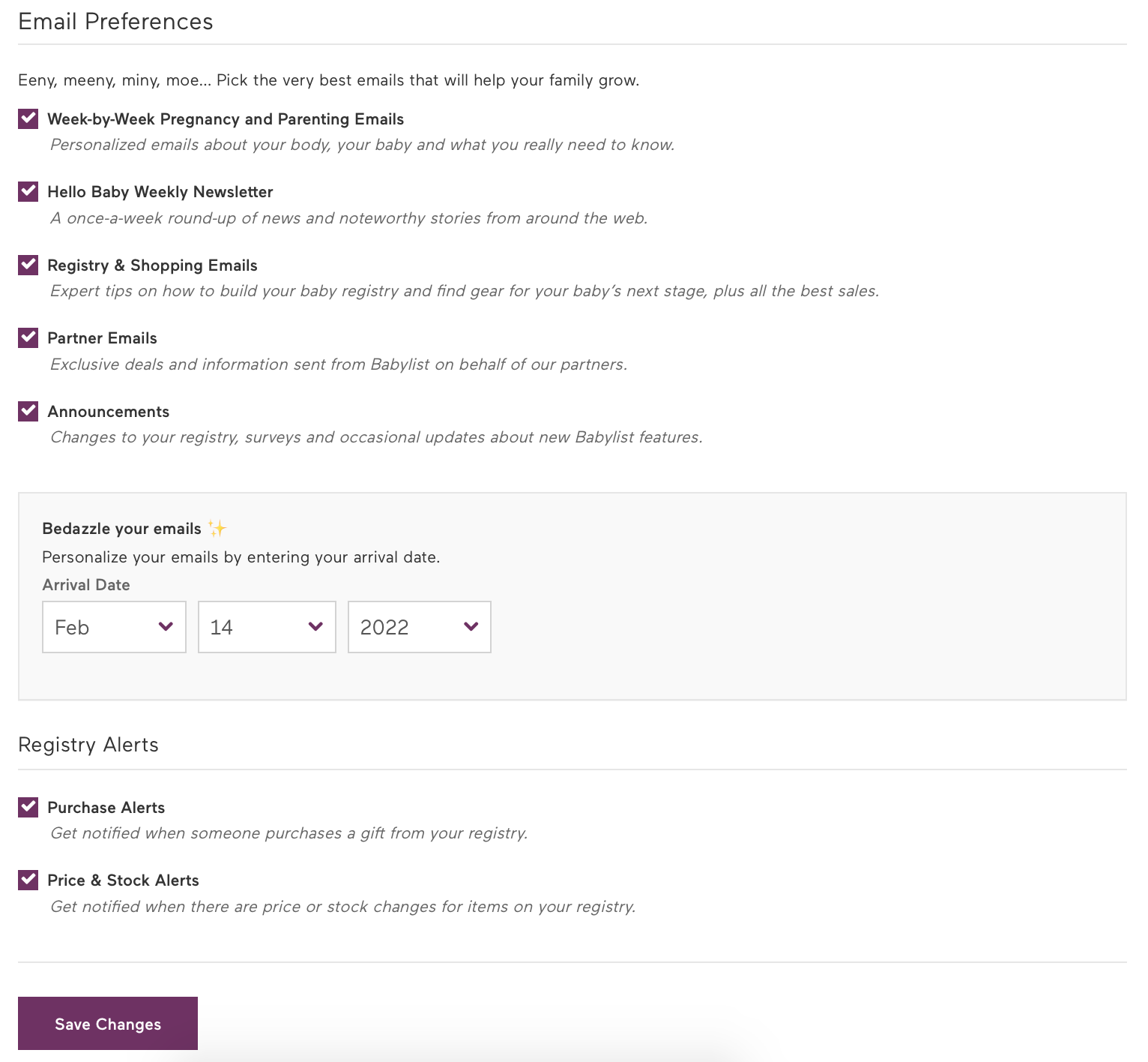Click your name in the top-right corner of your registry to open the menu. Select Settings > Email preferences.