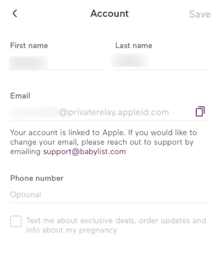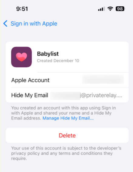 Once you open Babylist, you can view or delete the email address Apple created for your Babylist account. This can help if you want to check which address Apple is forwarding messages from.